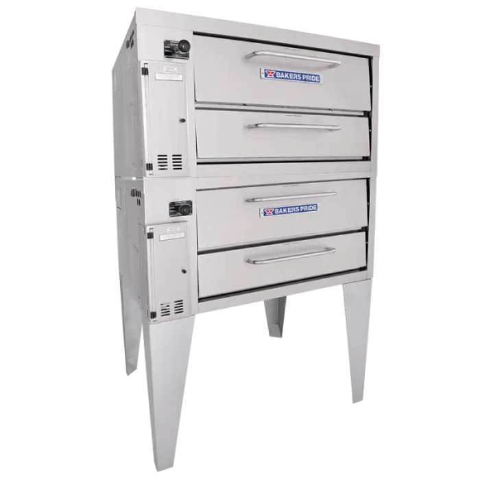 The Bakers PrideĀ® model 252 standard-depth double-stacked gas pizza oven is designed for all your high-volume baking needs. This double-stacked oven features two Cordierite decks with 8" deck heights and independently controlled top and bottom heat dampers for perfectly balanced results.This 48" wide model is constructed with heavy-duty angle iron frame, which is fully welded to allow for stacking. The oven exterior is heavy-duty stainless steel and fully insulated for cooler outer temperatures and consistent interior temperatures.