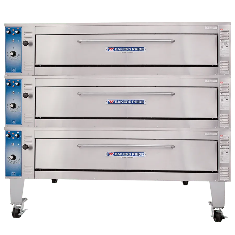 The Bakers Pride® model EP-3-8-5736 pizza oven is ideal for high-volume restaurants, offering the same durability and performance as our gas deck ovens with the low maintenance of an electrical system. This triple-stacked model has three Cordierite decks with 7” deck heights. The independently controlled, U-shaped heating elements on top and bottom allow for uniform temperatures and perfectly balanced baking. This model is constructed with heavy-duty, .25" angle iron frame, which is fully welded to allow for stacking.