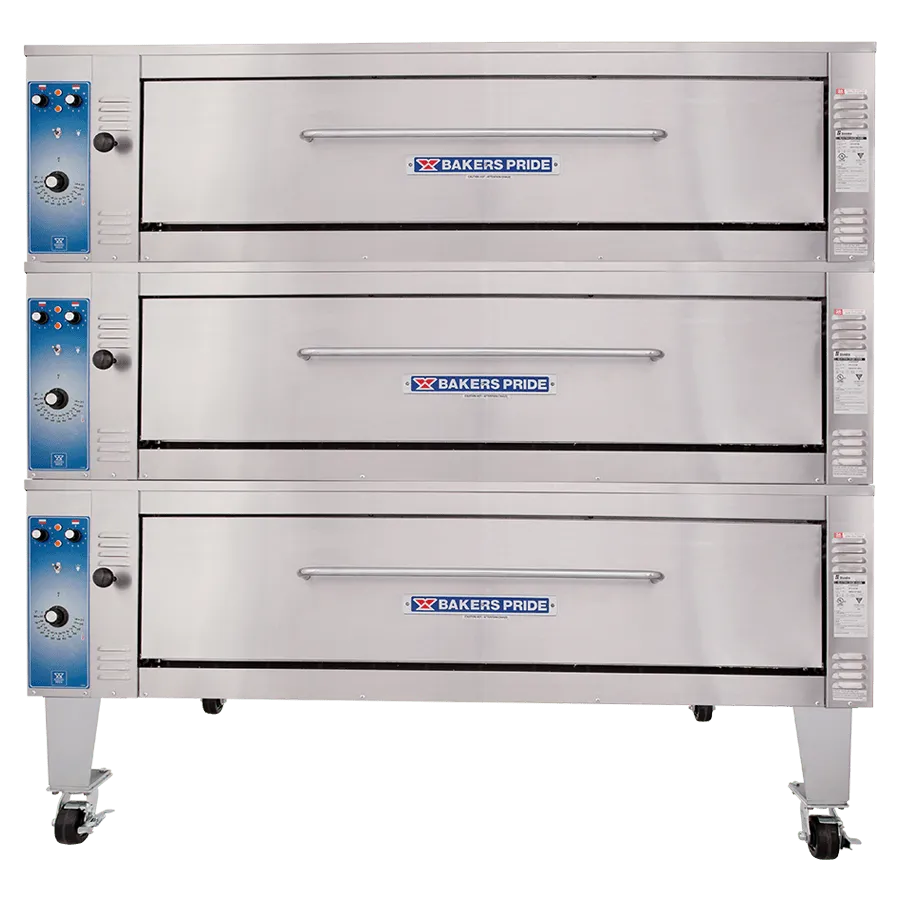 The Bakers Pride® model ER-3-12-5736 pizza oven is ideal for high-volume restaurants, offering the same durability and performance as our gas deck ovens but with the low maintenance of an electrical system. This triple-stacked model has three steel decks with 12” deck heights. The independently controlled, U-shaped heating elements on top and bottom allow for uniform temperatures and perfectly balanced baking. This model is constructed with heavy-duty, .25" angle iron frame, which is fully welded to allow for stacking.