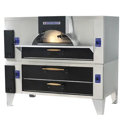 The Bakers PrideĀ® model FC-616/Y-600 pizza oven combines our Il Forno Classico oven with the Y-600 oven to add ambiance while doubling cooking capacity for the ultimate exhibition pizza kitchen. The top features a steel-reinforced, arched opening with a visible, open-flame burner to make loading pizzas easy while create dining atmosphere. This model is constructed with heavy-duty, .25" angle iron frame, which is fully welded to allow for stacking. It is designed to be built in behind a decorative facade of brick, stone, or tile for a traditional, old-world look, or you can simply display it in stainless steel or finish it with black-powder-coated control panels and hardwood door handles for an elegant presentation. The top oven has a Cordierite deck with 10" deck height, while the bottom oven has a Lightstone fibrament deck with 8" deck height. Each oven chamber features independently controlled top and bottom heat dampers for perfectly balanced results. Options are available to accommodate the configuration of your kitchen.