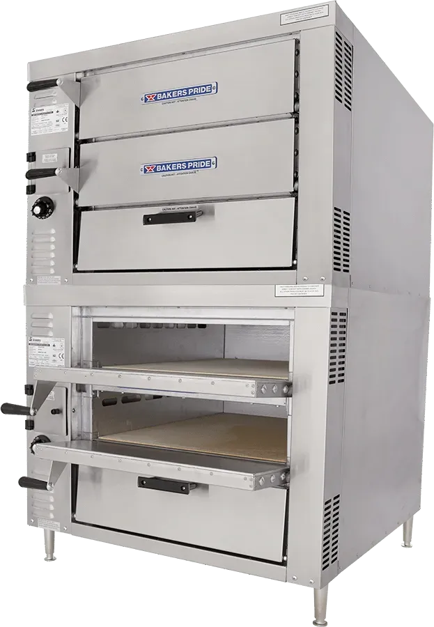The Bakers Pride® model GP52 oven is designed for baking pizza, pretzels, flatbreads, or other bakery items. This double-stacked model features a total of four baking chambers, each with one Cordierite deck. The lower decks are perfect for rapid baking, while the upper decks offer precision for slower baking. Deck height is 6" on the lower decks and 5" on the upper decks, but for more flexibility, the upper decks can be easily removed to create a 12” deck height. Doors are bottom-hinged with field-reversible handles for left- or right-hand operation. You also have the option of ordering single doors in lieu of double doors. This model comes standard with a stainless steel exterior and 4” adjustable legs. A standard combination valve incorporates a manual gas valve, pilot safety, and gas regulator. Available for use with natural gas or liquid propane.