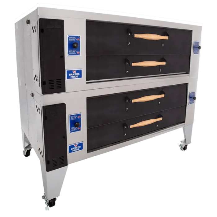 The Bakers PrideĀ® model Y-602BL-DSP extra-wide gas pizza oven is perfect for display cooking and exhibition kitchens. This model is designed to be built in behind a decorative facade of brick, stone, or tile. Optional front and side skirts allow tile or stone to be easily installed around the legs, while an optional dome top accent finishes off the old-world look. You also have the choice to simply display the oven in stainless steel or finish with black-powder-coated control panels and doors with hardwood handles for an elegant presentation. This model is constructed with heavy-duty, .25" angle iron frame, which is fully welded to allow for double-stacking. The oven chamber features a Lightstone fibrament deck with 8" deck height and independently controlled top and bottom heat dampers for perfectly balanced results. Options are available to suit the configuration of your kitchen, such as side-mounted controls or automatic oven starter.