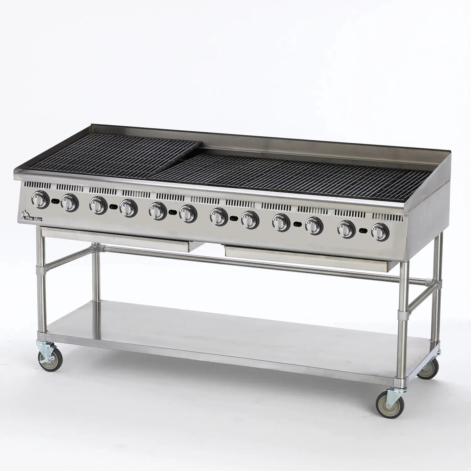 The Ultra-Max® radiant and lava rock charbroilers are constructed in the U.S.A. with a corrosion-resistant stainless steel body. The charbroilers will either use lava rocks or heavy- duty radiants to transfer heat to product. Grates are adjustable per section to be enclined or flat. The units feature cast iron burners which produce 20,000 BTUs per six 6 inches of width and have adjustable valves and a standing pilot. Units will be shipped being set up for Natural Gas, and will include field conversion kit for LP gas. Standard gas connection is 3/4-inch N.P.T. For lava rock models, a five 5 pound bag of lava rocks will be provided for each twelve 12 inches of width.