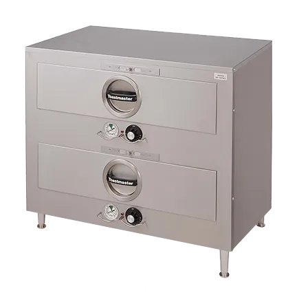 The Toastmaster 3B84DT09 freestanding warming drawer has two drawers and is designed to hold cooked foods at a safe, thermometer verified serving temperature with proper moisture content. Holding temperature and moisture content can be set for the type of food being held. This model holds a 20" x 12" x 5" steam pan and utilizes 120 volt power and has dual thermostats.