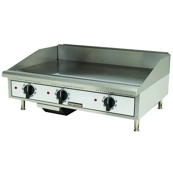 The Toastmaster TMGT Series Gas Griddle features a 3/4" polished steel plate that provides ultra-smooth, even heating across its wide cooking surface in various sizes. Equipped with a precise thermostat adjustable from 150°F to 450°F, it ensures consistent cooking temperatures. Its stainless-steel front enhances durability, while the efficient grease management system simplifies cleaning and maintenance.